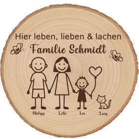 Lieferung: 1 Baumscheibe mit Rinde Motiv Hier leben, lieben & lachen Familie mit Familien- und Vornamen