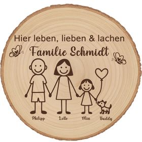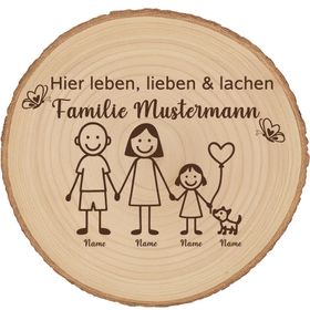 Lieferung: 1 Baumscheibe mit Rinde Motiv Hier leben, lieben & lachen Familie mit Familien- und Vornamen