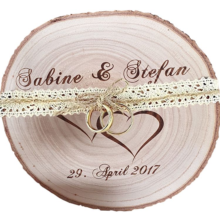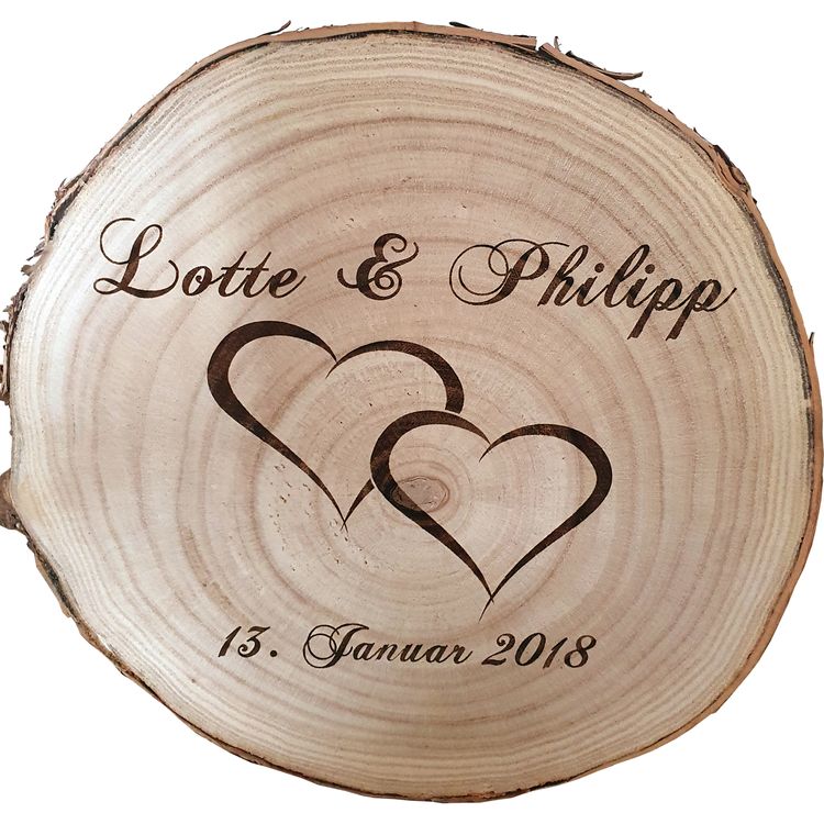 Lieferung: 1 Baumscheibe mit Rinde Motiv Doppelherz personalisiert mit Wunschnamen und Datum