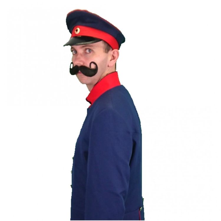 Klassische dunkelblaue preußische Uniformmütze für Herren mit verstellbarer Größe. Dunkelblaue Preußen-Kappe mit rotem Band und schwarzem Schild. Die Kopfweite ist auf der Rückseite durch einen Klettverschluss verstellbar.