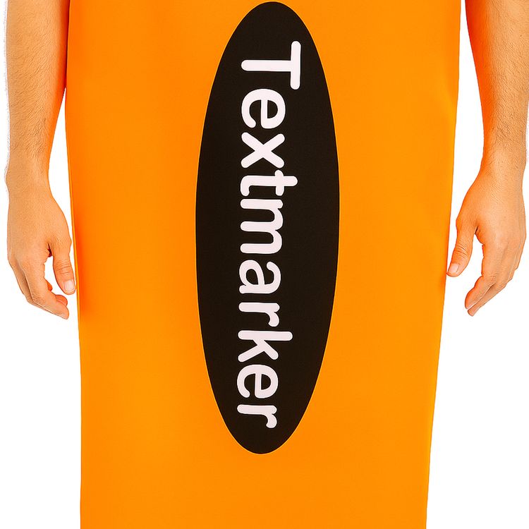 Die übergroße, bedruckte Tunika verwandelt dich im Handumdrehen in einen knalligen Marker – inklusive passender Kopfbedeckung in Form einer Kappe, die wie die Stiftkappe aussieht. Einfach reinschlüpfen, drüberziehen und los geht’s – kein Zurechtrücken, kein Friemeln, 100 Prozent Aufmerksamkeitsgarantie. Die Tunika ist etwa 108 Zentimeter lang und in weißer Schrift auf schwarzem Hintergrund mit dem Wort "Textmarker" bedruckt.