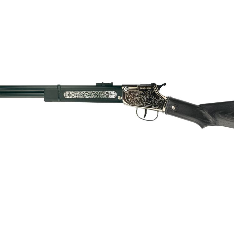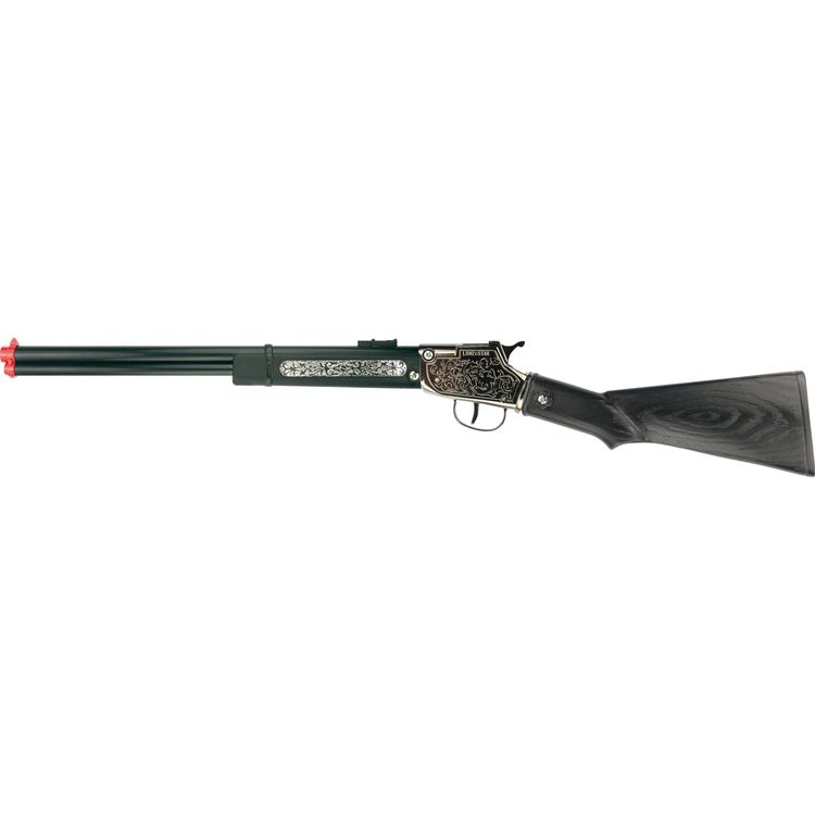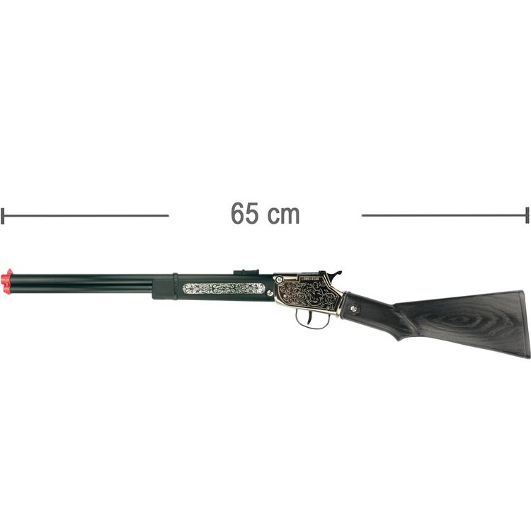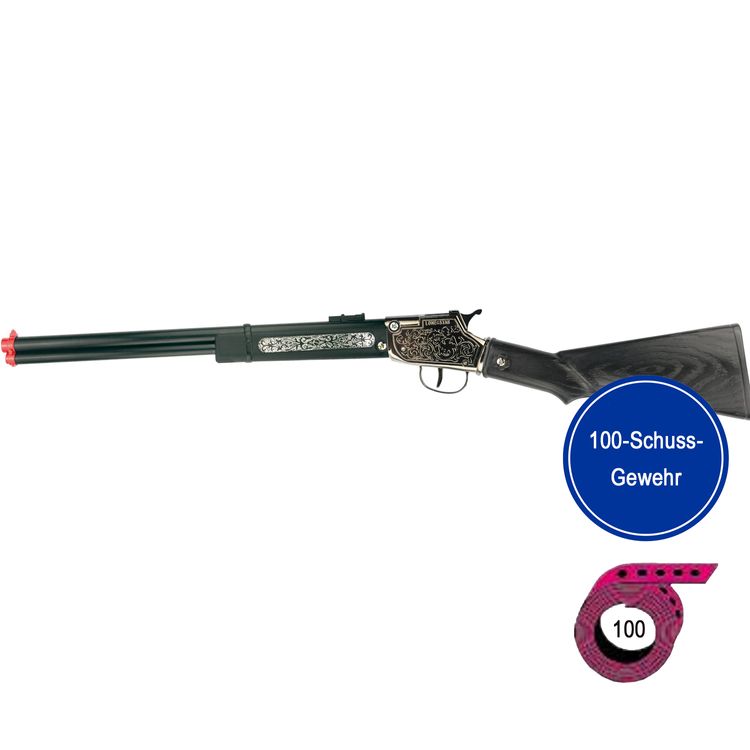 Qualitativ hochwertiges Spielzeug-Gewehr für Kinder und Erwachsene! Das schwarze Cowboy-Gewehr überzeugt im angesagten used-Look und ist mit silbernen Ornamenten verziert. Das Gewehr ist für 100-Schuss-Amorcesbänder (Zündplättchen) geeignet und etwa 65 Zentimeter lang! Der Griff ist aus 100 Prozent Metall gefertigt, die übrigen Teile der Flinte aus Kunststoff.