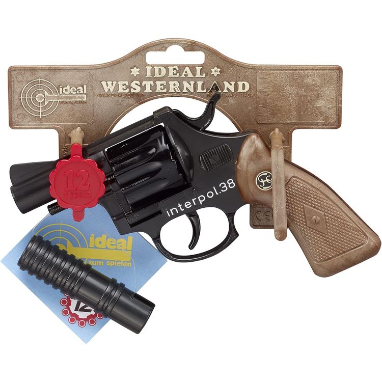 Mit der schwarz-braunen Spielzeug-Pistole "Interpol 38" kommen große und kleine Revolver-Fans voll auf ihre Kosten! Egal ob als Polizist oder Agent - diese 23 Zentimeter lange Polizei-Pistole verleiht Ihrem Outfit den letzten Feinschliff und komplettiert Ihr Kostüm! Die 12-Schuss-Pistole ist aus stabilem Kunststoff gefertigt und überzeugt besonders durch den handlichen, braunen Griff in Holz-Optik und die bewegliche Trommel aus Zink! Der Griff ist mit den Initialen "JGS" des Herstellers "J. G. Schrödel" detailreich gestaltet. Lieferung inklusiver schwarzem Schalldämpfer, der auf die Pistole aufgeschraubt werden kann.
