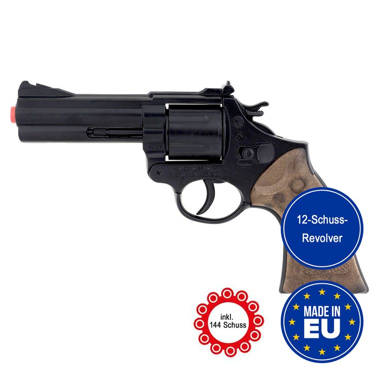 Das schwarz-braune Gehäuse aus robustem Druckguss-Metall und hochwertigem Plastik sorgt nicht nur für eine authentische Optik, sondern auch für Langlebigkeit und Spielspaß. Hergestellt in Spanien, steht dieser Revolver für erstklassige Qualität und detailgetreue Verarbeitung. Im Lieferumfang ist ein Blister mit zwölf Munitionsringen a zwölf Schuss - insgesamt also 144 Schuss. Qualitativ hochwertige Spielzeug-Munition made in Germany! Ungefährlich, erzeugt lediglich einen lauten Knall. Die klassische Kombination aus Schwarz und Braun verleiht dem Revolver eine zeitlose Eleganz, die zu jeder Uniform passt.