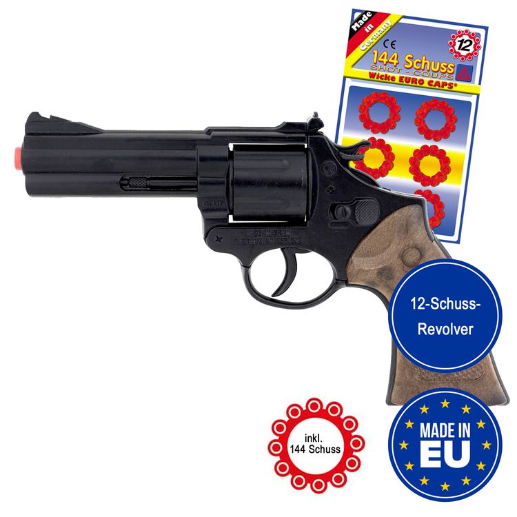 Lieferung: 2-tlg. Revolver und Blisterkarte mit 144 Schuss (12-Schuss-Ringe-Munition)